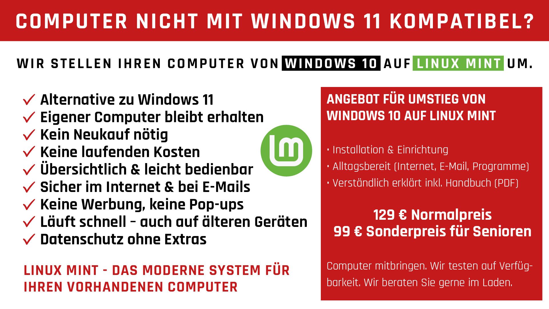 Die Umstellung eignet sich für Rechner mit Windows 7, 8 oder 10, sofern die technischen Voraussetzungen erfüllt sind. Vorab prüfen wir, ob Ihr Computer geeignet ist, und beraten Sie persönlich bei uns im Laden.